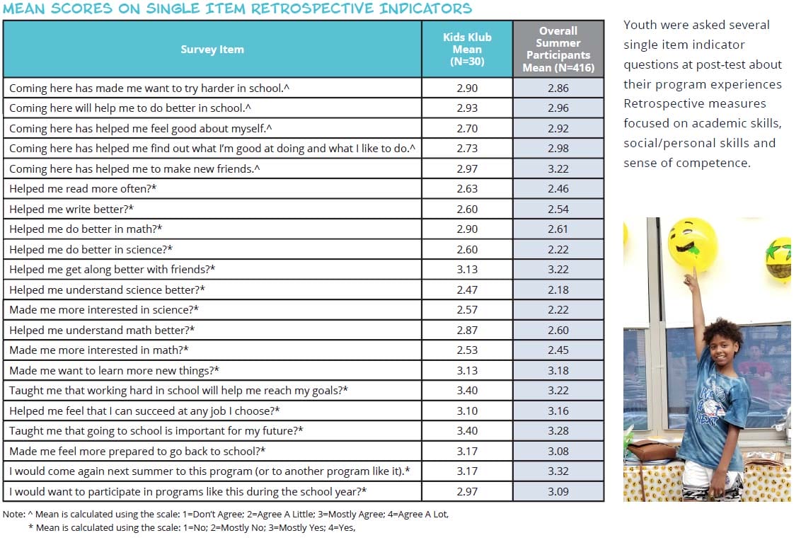 Youth were asked several single item indicator questions at post-test about their program experiences Retrospective measures focused on academic skills, social/personal skills and sense of competence.